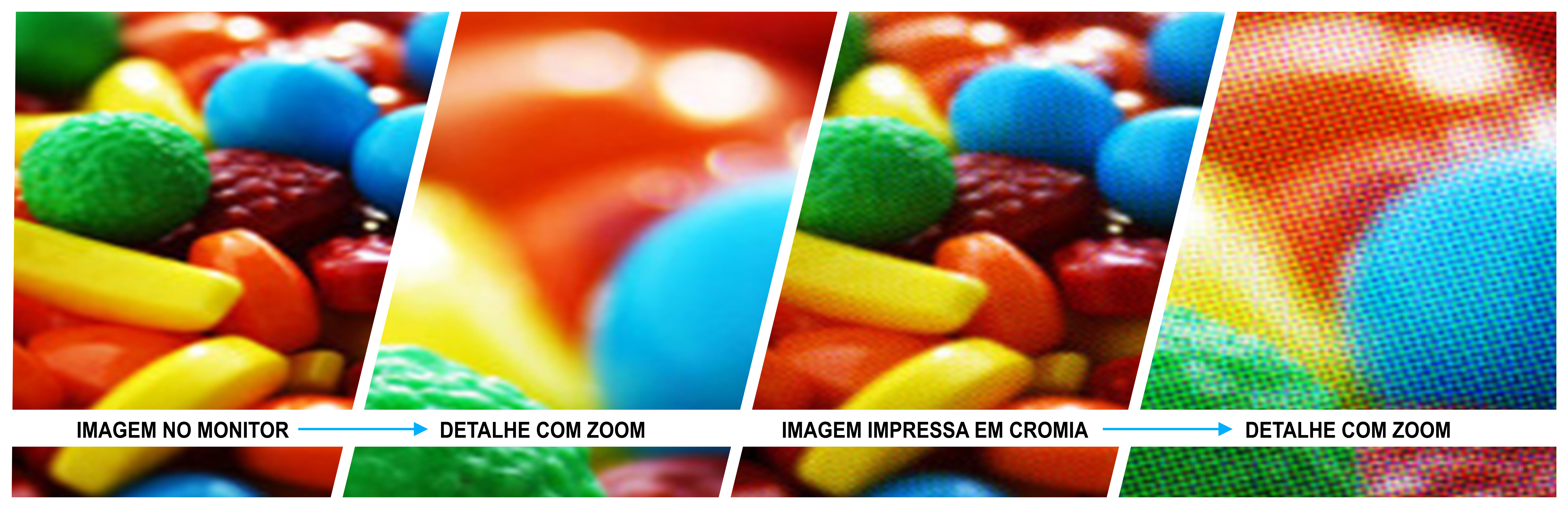 através da aplicação de 4 canais de cores (Ciano, Magenta, Amarelo e Preto). É utilizada uma tinta própria translúcida,